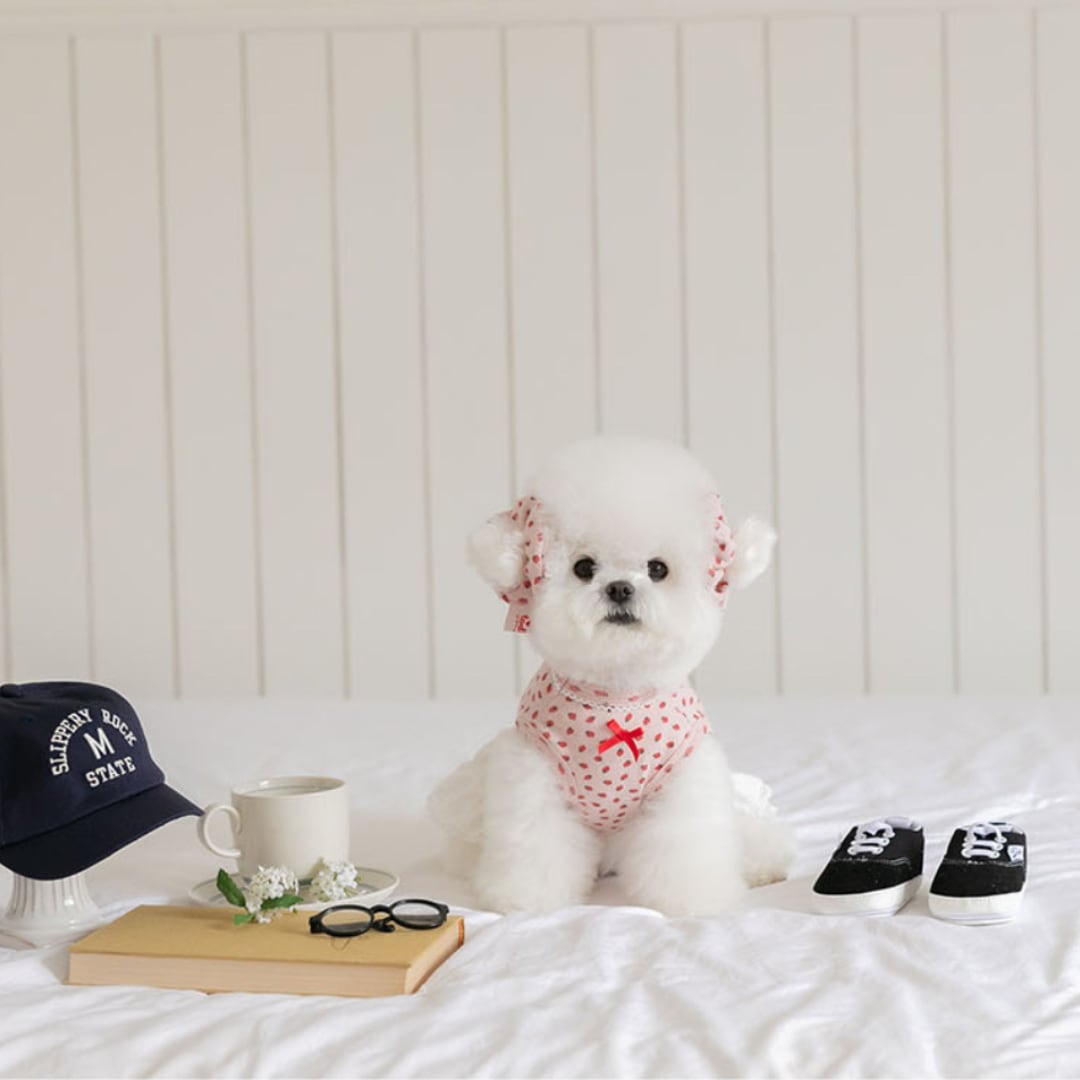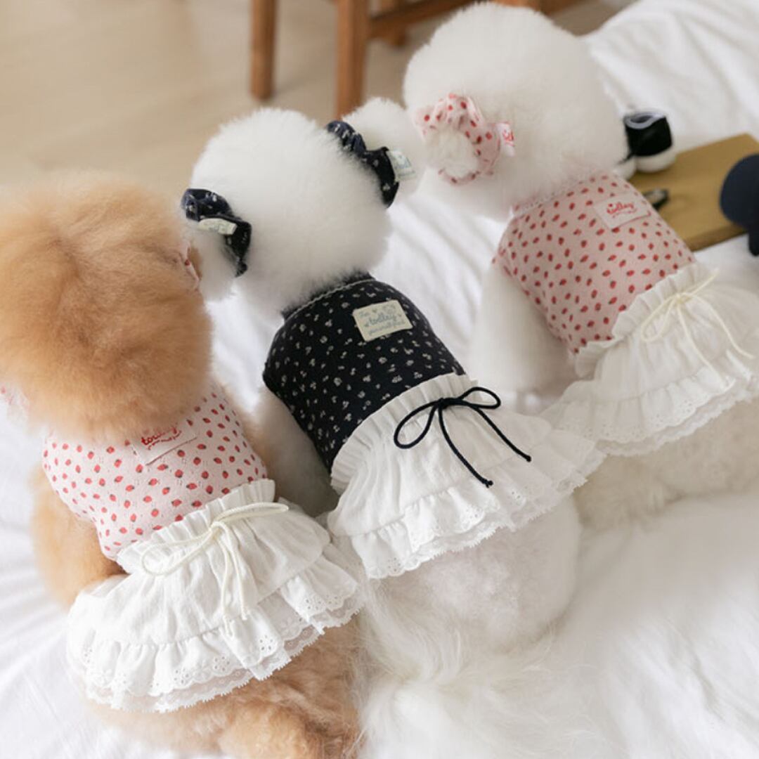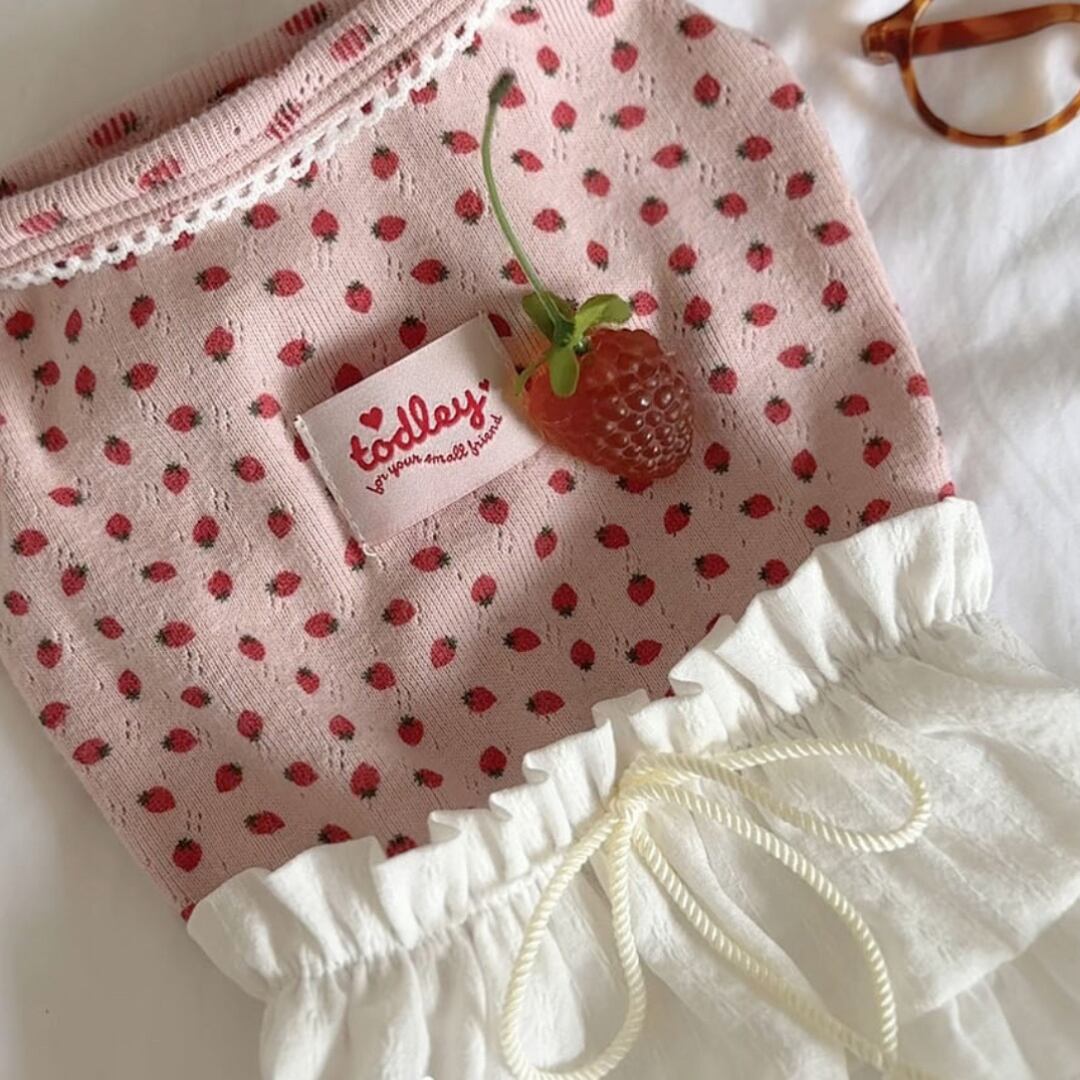 かわいいストロベリーがプリントされた生地に、フリルレーススカートがついたワンピース♡