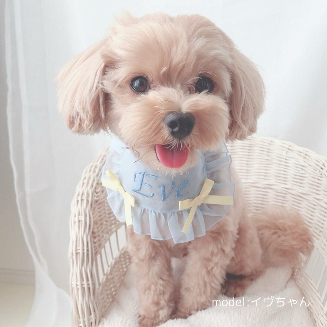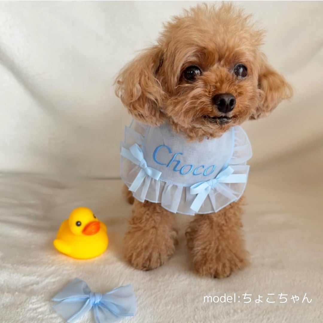 リボンで結ぶタイプで、首周り調整可能です